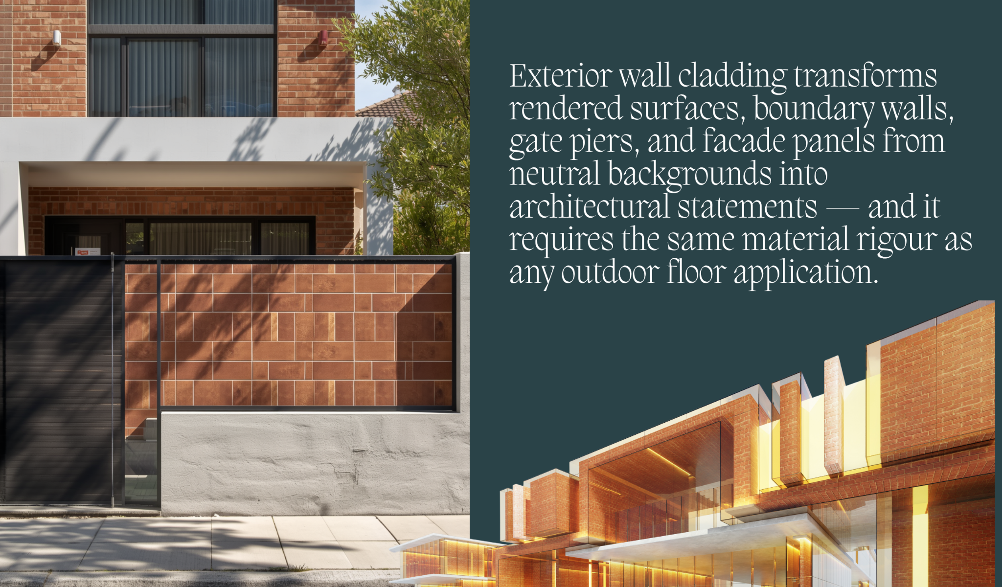 What they share is the engineering: these are not interior tiles repurposed for outdoor use. They are designed from the outset for the exposure conditions of exterior walls.