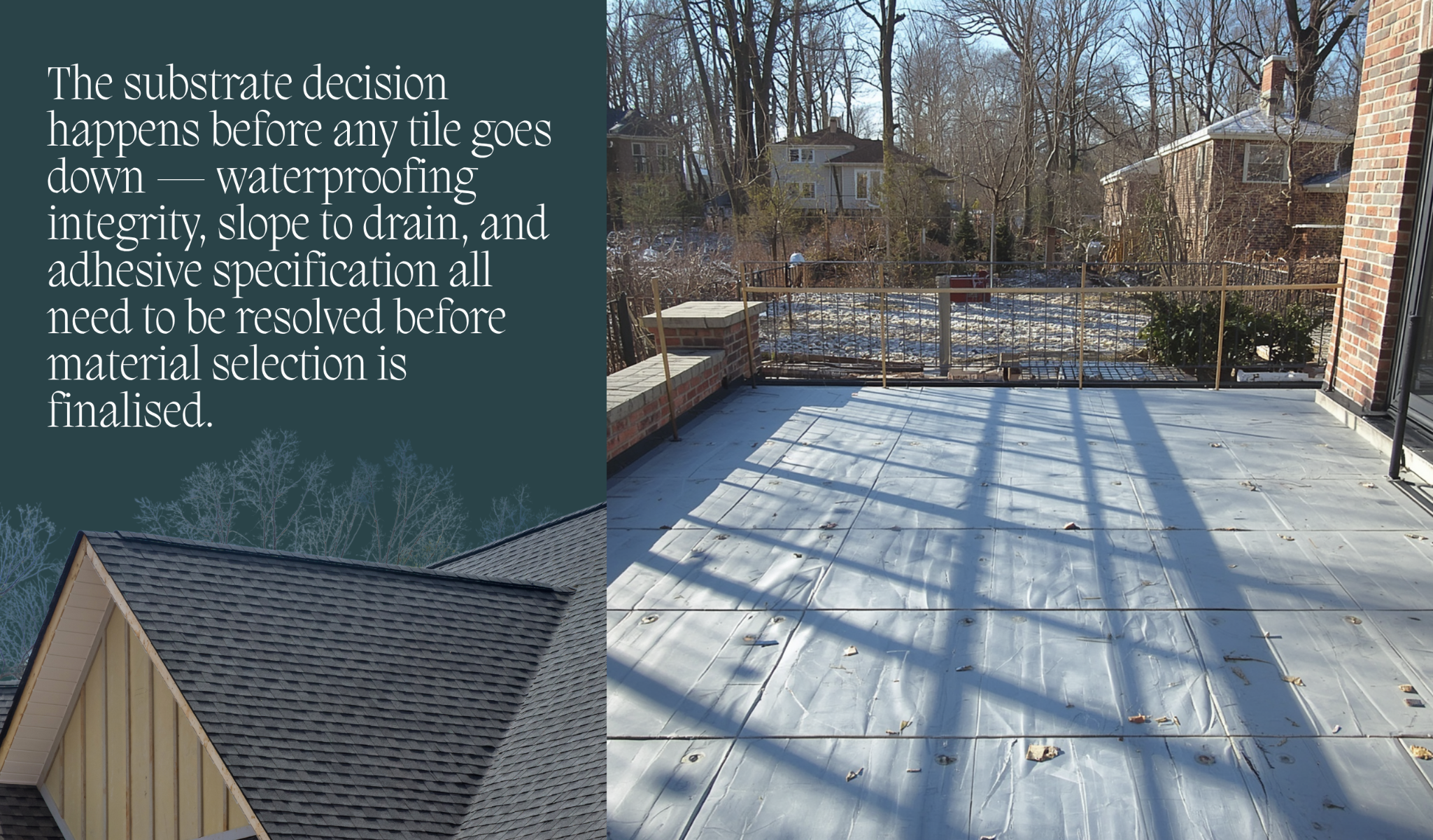 Spring is the right time to confirm three things in order: the waterproofing membrane specification for any elevated deck or balcony application; the drainage slope (a minimum 1/8 inch per foot fall toward drain points prevents pooling and accelerates material failure if ignored); and the adhesive and grout specification appropriate to your climate.